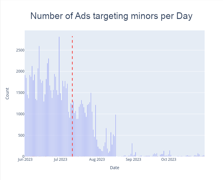 The figure below shows how the frequency of ads that target minors and use profiling has evolved in the last months; the red vertical line marks 11 July. As you can see, the platform has been allowing this practice and has continued to do so well past its self-imposed deadline. However, it is also clear that the practice is being discontinued, with some days even exhibiting zero ads. This could mean TikTok is enforcing its decision gradually or that advertisers are aware of the new rules and simply to do attempt to target minors to the same extent.
