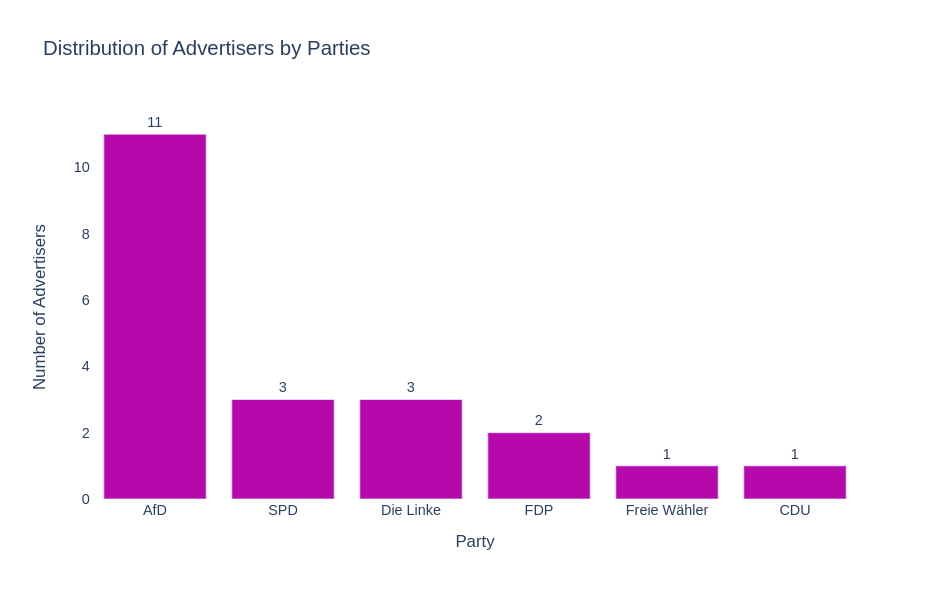 While the SPD posted the most ads in total, the majority is related to one campaign. If we look at the number of different accounts that used ads we can see that members of the AfD made the most attempts of posting political ads: