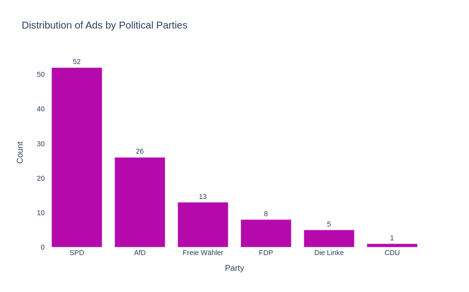 In the meantime, our limited approach offers a glimpse at the prevalence of political ads in specific contexts. But there is a major limitation: comparing politicians names with the available data only brings up those ads that are provided or paid for directly by political parties and candidates themselves. It is possible that political ads that are provided by third parties (e.g., lobby groups) could be even more prevalent, as they could be used to intentionally circumvent TikToks ban as well als political regulation on political ads.