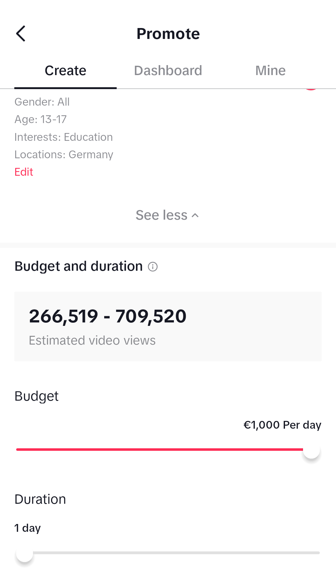 However, this limited data disclosure has only been implemented for the estimated audience. After specifying the targeting criteria for an ad, we are asked to specify the budget and duration of the ad placement. In that process (as seen in the screenshot below) TikTok discloses our adsā āEstimated video viewsā. While TikTok does not disclose the exact audience size of 13-17-year-olds in Germany who are interested in Education, we now see a lower bound for the same target group and learn that about 266.519 to 709.520 users in that audience are expected to be online within a day.
