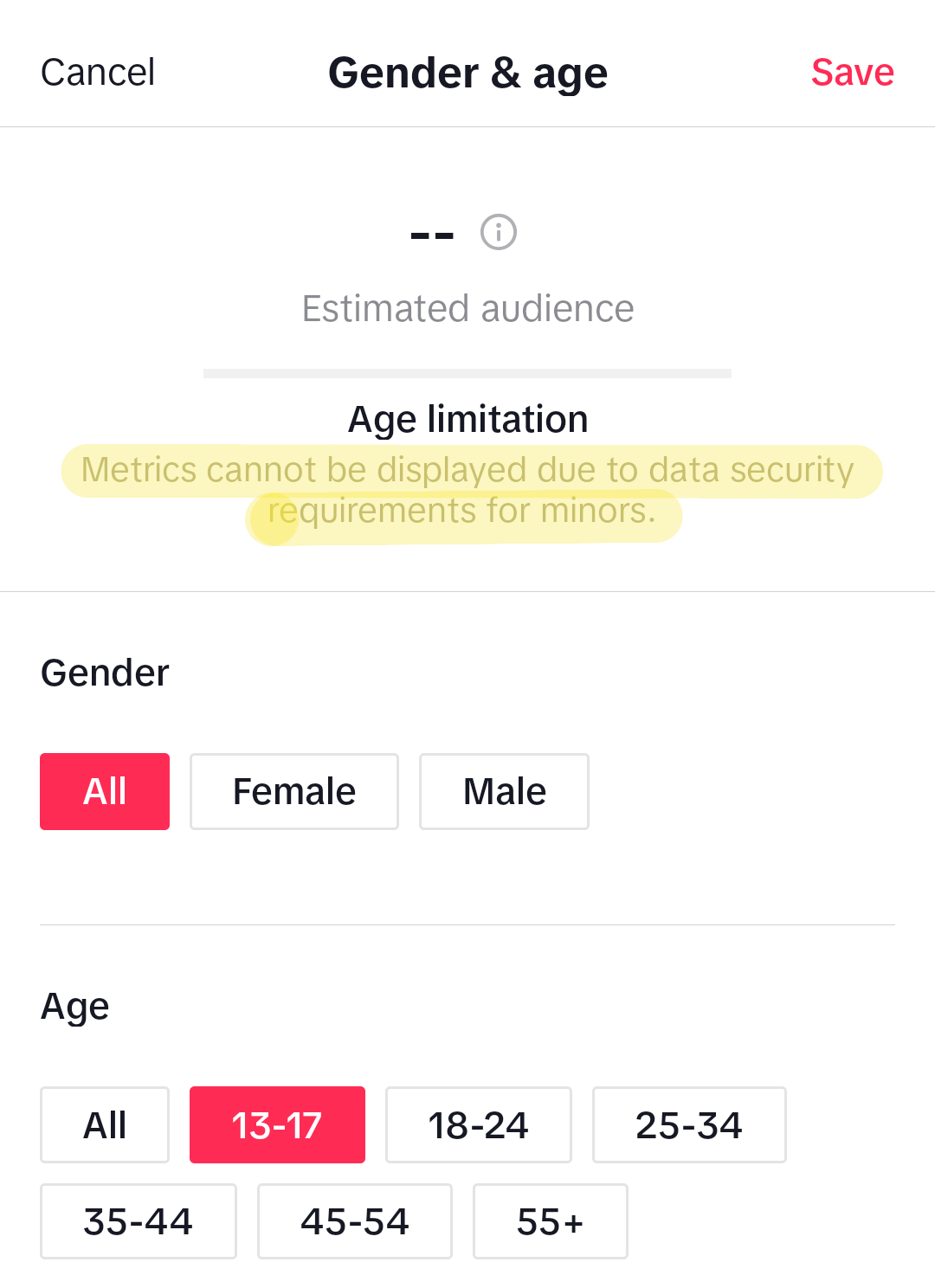 Screenshot from the TikTok App not-showing estimates for the audience size for 13-17 yo