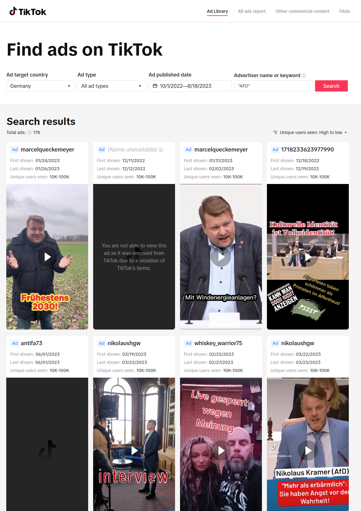 In the corresponding FAQ they point out, that “TikTok does not show political or election ads on the platform. So you will not be able to find ads of political nature in the Commercial Content Library”. But surprisingly, it is not complicated at all to find such ads. Even though the library lacks important information, the way how easy it is to find political advertising raises questions on how seriously TikTok enforces these guidelines. A simple search for the abbreviations of German political parties already shows numerous examples of ads placed by politicians or parties as well as a seemingly endless number of political ads by other people. Especially politicians of the “AfD” seem to use ads on TikTok systematically to reach out to potential voters. We found examples of accounts from members of the German parliament (MdBs) and members from the federal parliaments (MdLs). Besides that, we found even more political ads promoting the AfD, that are not associated with an official account of a member of the party. Even though other parties don’t seem to use TikTok ads to a similar extent, we also found examples of accounts of city and local chapters of political parties advertising political content.