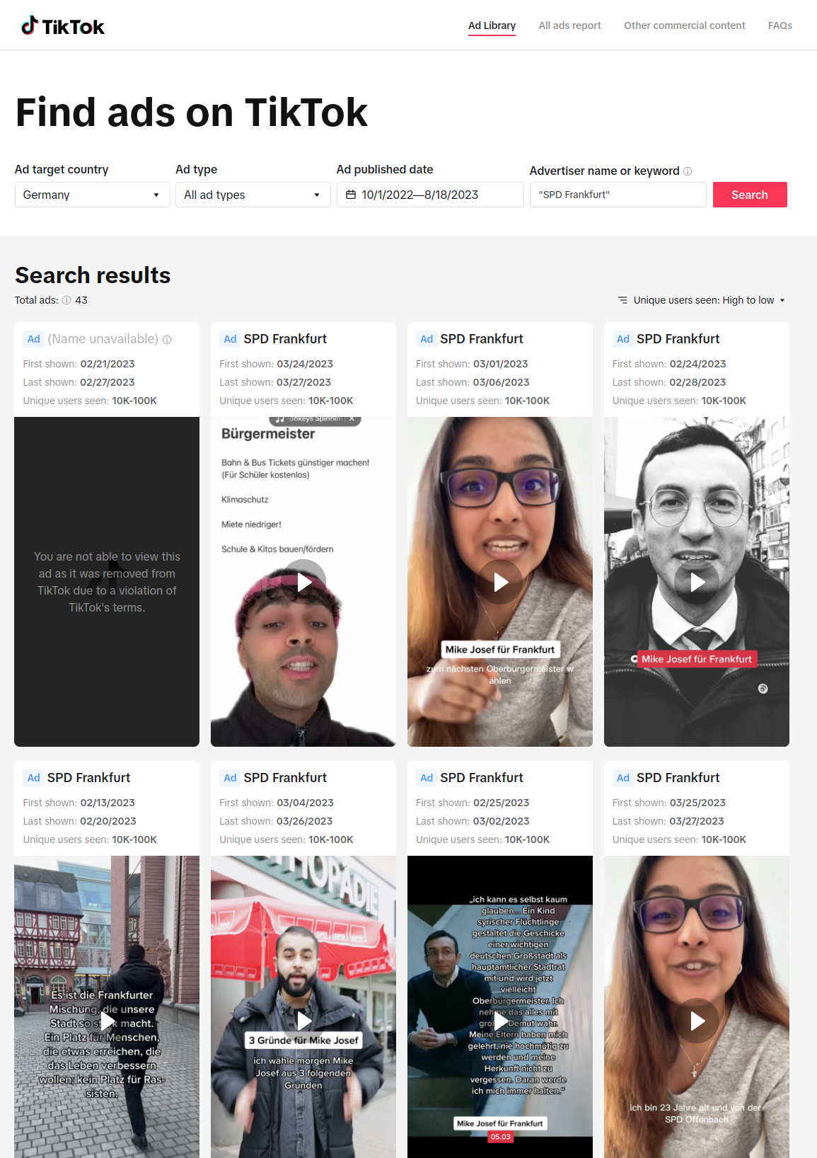 Nevertheless, it was very easy to find anecdotal evidence from TikTok´s ad library, to show that there is a lack of enforcement on the political advertising guidelines. A systematic analysis is currently not possible due to lack of information provided by the library. We hope, that TikTok adjusts the functionality and provides more information, so that researchers can use the ad library to conduct systematic research.