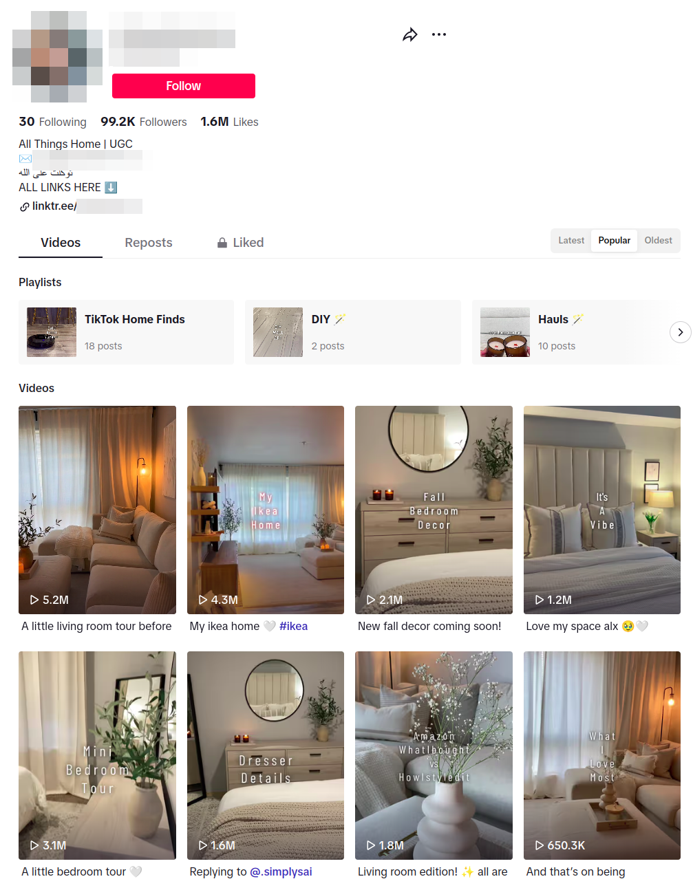 As TikTok’s recommender system fine-tunes content to user preferences, it also introduces commercial content in ways that are not always transparent. While some ads are clearly marked, much of the promotional content on the platform exists in a grey zone, where it is not formally recognized as advertising but still serves commercial purposes. This raises important questions about consumer protection and the platform’s responsibility in clearly distinguishing between organic content and ads. One example of such an account is shown in the screenshots below. It is an account that continuously advertises home decoration products and promotes their shop, but has not labeled any of their videos as commercial.