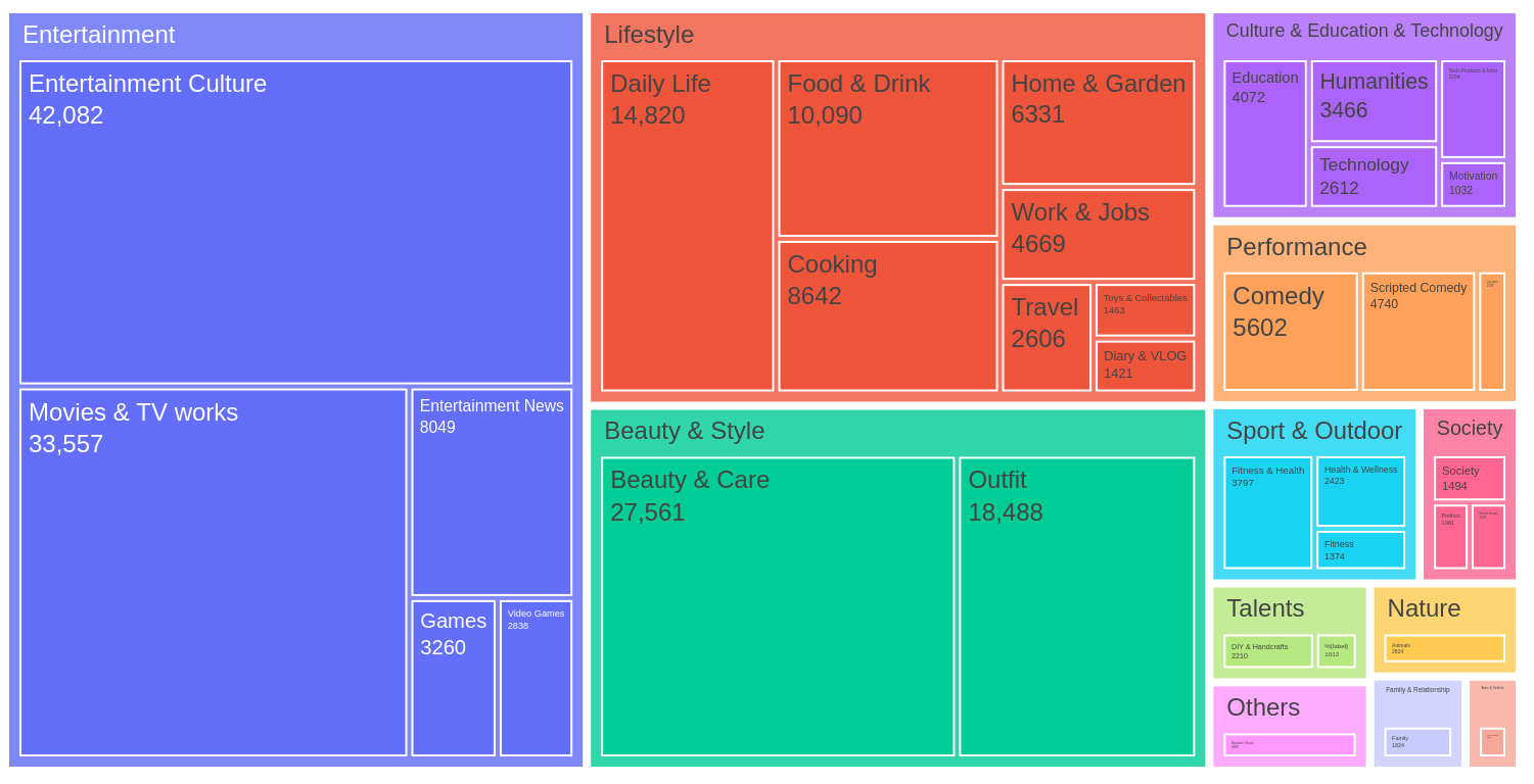 TikTok’s interest taxonomy is organized in a tree-structure with 13 high-level categories like “Entertainment” or “Lifestyle” and a varying level of detailed subcategories, for example: Lifestyle > Food & Drink > Mukbangs & Tasting. The following chart shows the prevelance of interests assigned to the videos in our dataset.