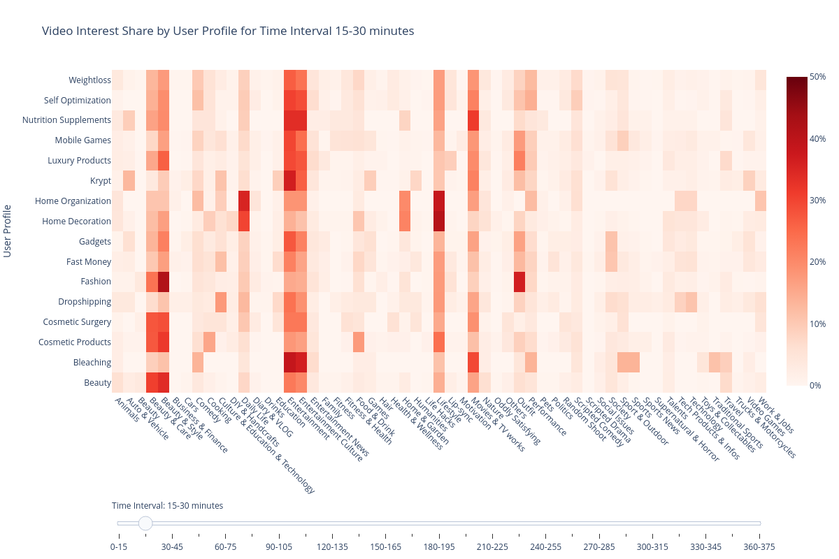 Moving the slider shows how the interests change in the later stages, such as the 45-60 minute interval, accounts seem to get more personalized as the share of “Entertainment” videos is reduced. There is no longer a shared focus on one category among all accounts. Categories that match the profile become more prevalent, such as “Outfit” for fashion accounts or “Lifestyle” for home organization accounts.